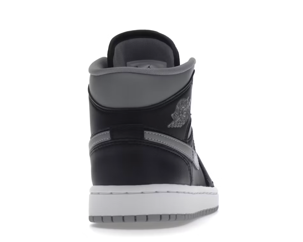Leather and rubber are the main types of materials used in the manufacture of Air Jordan 1 Mid GS Shadow (W). Its upper part is made of supple grey leather with accents of black and a Swoosh that matches the color. This rests on a white rubber outsole, which has bouncy properties.