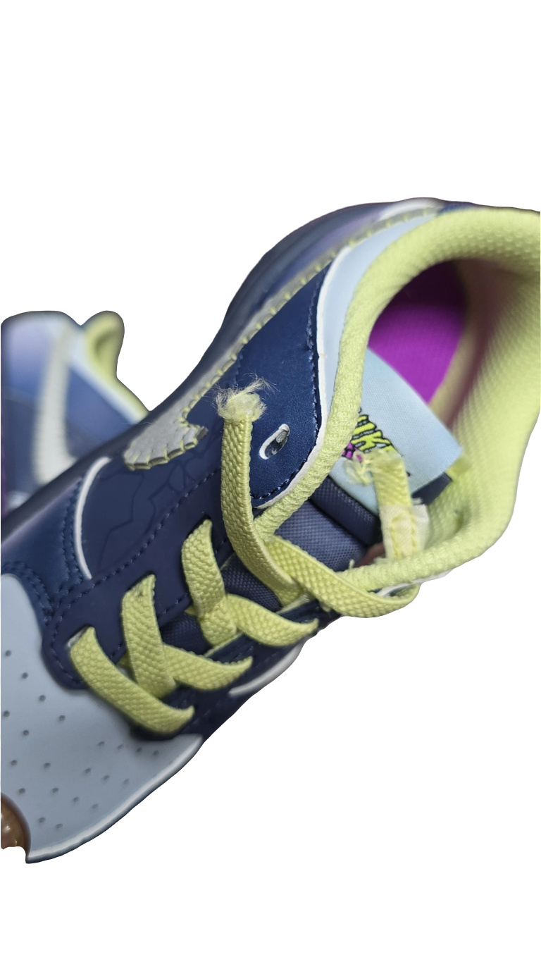 The leather upper features various shades of blue, including Diffused Blue and Blue Tint, while the heel and forefoot overlays display a faded blue gradient. Jagged high-voltage lines decorate the Diffused Blue quarter panel and resemble lightning or cracked glass. Another spooky element is the exaggerated stitching, which outlines the gray leather Swoosh logo on the side panel. These rows of stitches come in Luminous Green and look like medical stitches. Luminous Green accents are also on the collar lining and the durable laces. Like other Dunk Low models, this version features perforations across the vamp.