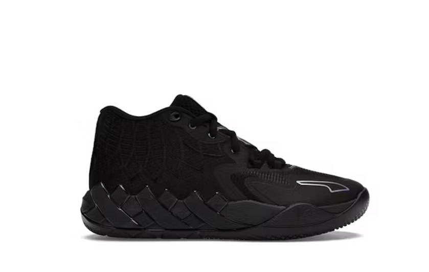 The LaMelo Ball MB01 sneaker has a monochromatic design in all black, coupled with luminous accents. The shoe is primarily made from a mixture of plastic, rubber, and mesh materials. The midsole is made out of foam, while the sole is made out of non-slip rubber. The tongue features silver designs and several small inscriptions, as well as black laces on top.